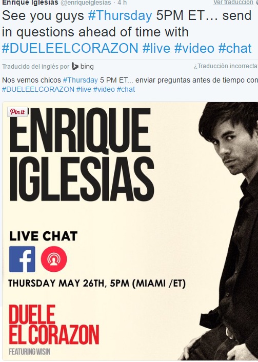 El jueves 26 de mayo,Enrique estará en directo en facebook,en un vídeo chat,contestando a nuestras preguntas a las 11 de la noche(hora de España,(5pm hora de Miami)